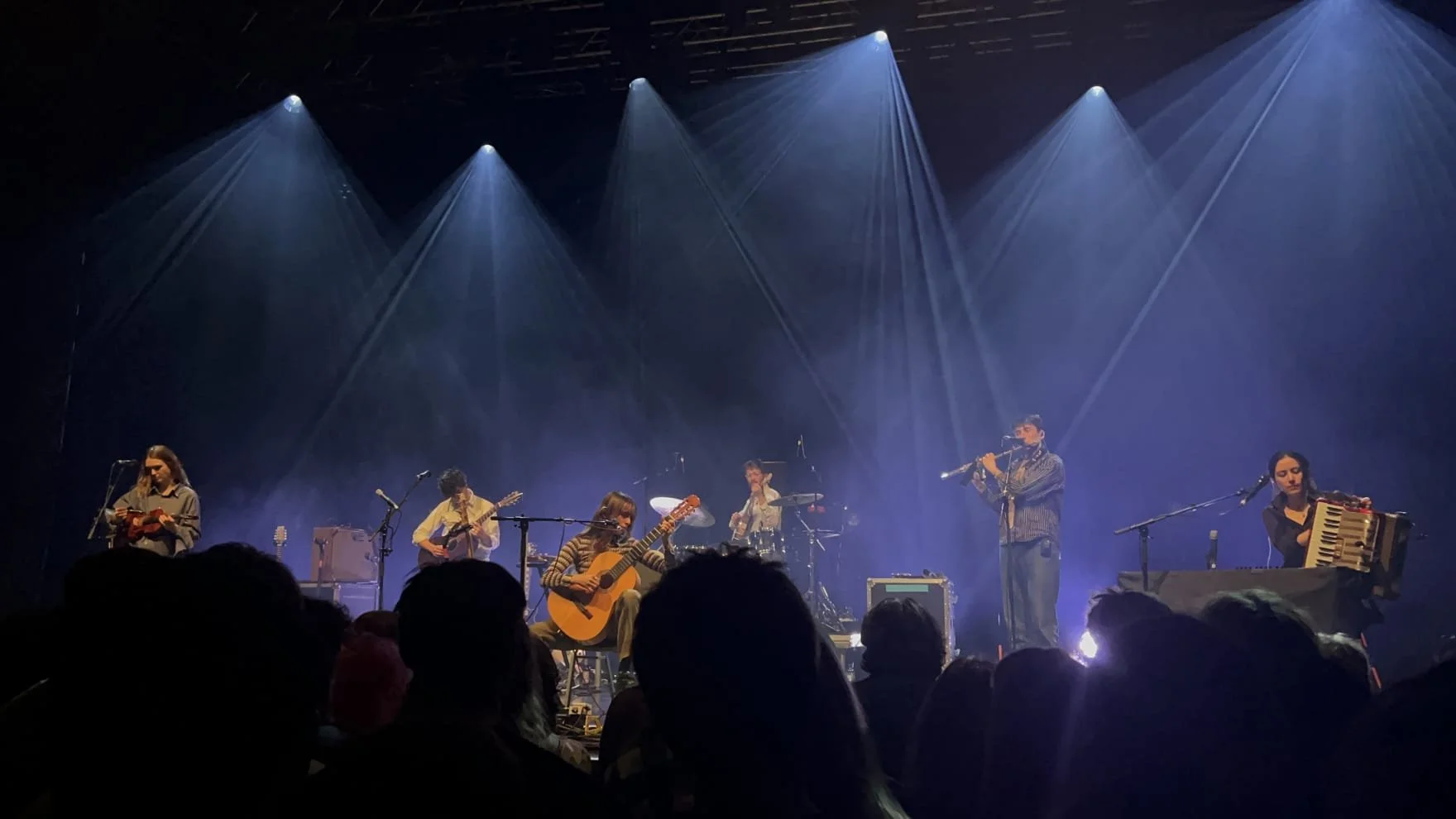 Le son de la musique live rend l'expérience immersive et nous transporte dans le monde de Black Country, New Road. Beaucoup de choses se passent en même temps sur scène, les instruments dialoguent, les voix s’harmonisent créant une cacophonie parfaitement maîtrisée et équilibrée par des moments plus tranquilles et émouvants.